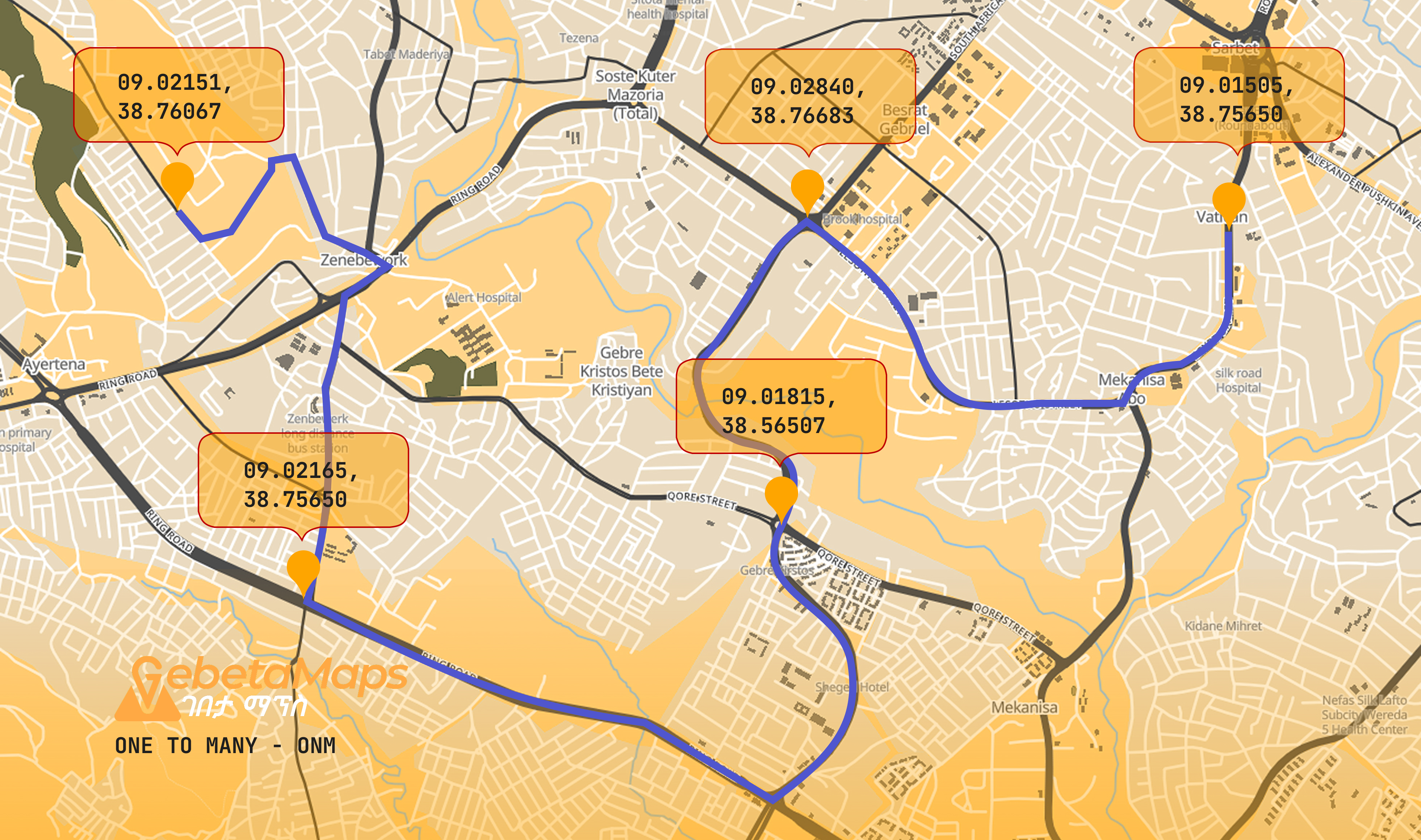 GebetaMaps API one-to-many routing feature allows you to easily generate optimized routes from a single point to multiple destinations. Whether managing deliveries, planning logistics, or mapping out multiple stops, our API ensures that your users receive the most efficient paths to all their endpoints in one go